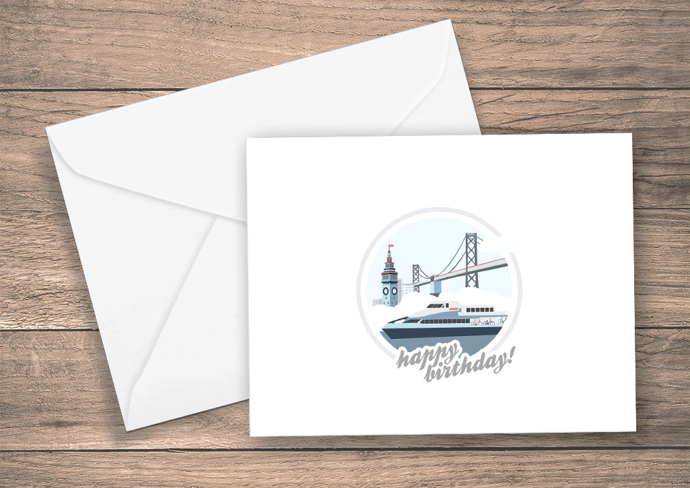 <li>Our Happy Birthday card (center) shows bikes on a ferry cruising along the Embarcadero and under the Bay Bridge.</li>