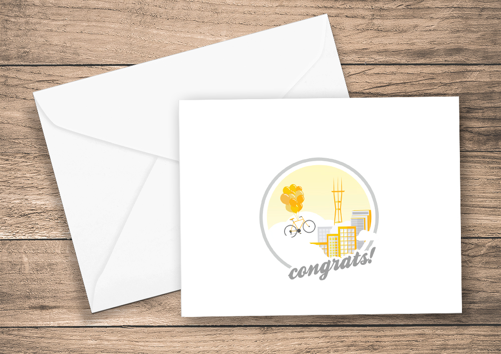 <li>Our Congrats card (left) has a bike being floated by balloons against a classic San Francisco skyline.</li>