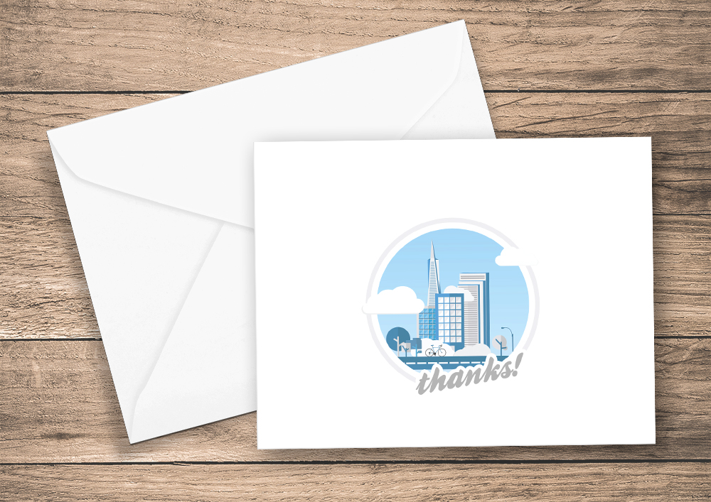<li>Our Thanks card (right) shows a bike on a tree-lined street with some of our most famous skyscrapers in the background.</li>