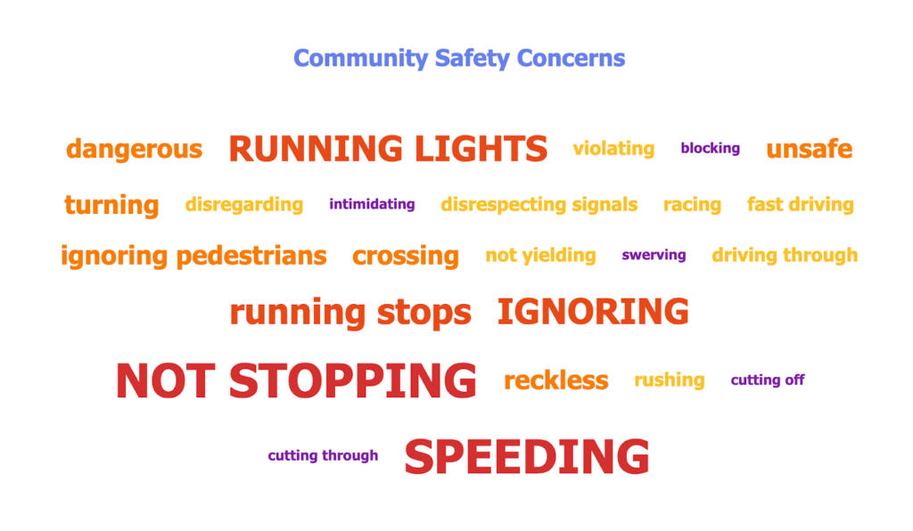 For many people living in Bayview-Hunters Point and the Western Addition, speeding and unsafe driving are the top issues that make streets feel unsafe for people taking the bus, biking, or walking. This feedback, and the language pictured above, describes what we heard regularly from the survey responses and participants at our meeting. We also heard that fear of taking public transportation and a lack of transit connectivity also posed barriers specific to taking the bus.