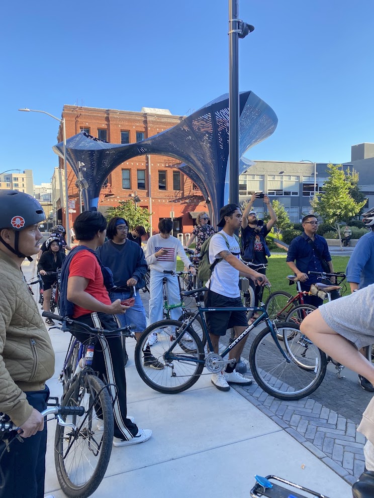 On our nearly two-hour long ride, I spoke with many participants, some who ride bikes regularly and some of whom were riding for the first time in a long time. It was a casual, no-drop trip through downtown during afternoon rush hour that was full of laughter, young people singing along with Tagalog pop songs, and more tender moments feeling a sense of belonging riding with such a large group of other Filipino-Americans.